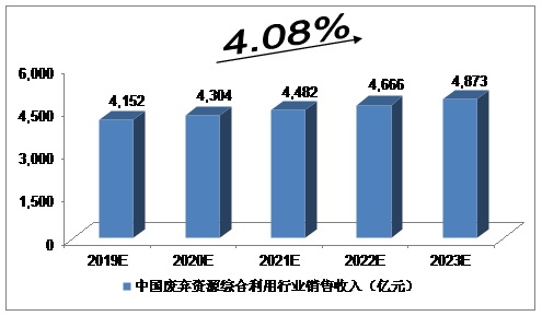 ? ? 我們預計,2019年我國廢棄資源綜合利用行業(yè)銷(xiāo)售收入將達到4,152億元,未來(lái)五年(2019-2023)年均復合增長(cháng)率約為4.08%,2023年將達到4,873億元。