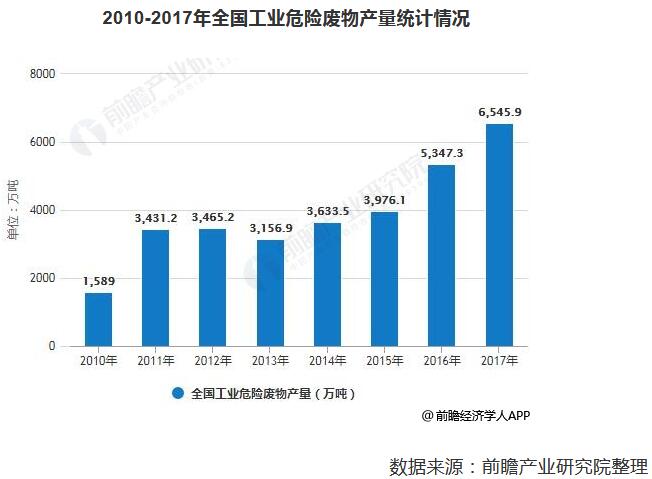 ? ? 近年來(lái),隨著(zhù)我國經(jīng)濟總量不斷擴大,工業(yè)危險廢物產(chǎn)量也出現明顯增加。2010年全國工業(yè)危險廢物產(chǎn)量已達1589萬(wàn)噸,2012年全國工業(yè)危險廢物產(chǎn)量增長(cháng)至3465.2萬(wàn)噸,2013年有所下降,之后繼續增長(cháng),到了2016年全國工業(yè)危險廢物產(chǎn)量達到5347.3萬(wàn)噸,較上年同比增長(cháng)34.49%。截止到2017年全國工業(yè)危險廢物產(chǎn)量達到突破6500萬(wàn)噸。但有效處理量不足,危險廢物處理水平有待提高。