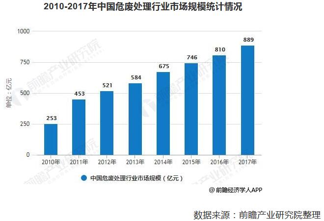 ? ? 我國危廢處理行業(yè)自2001年左右起步,經(jīng)過(guò)十多年的發(fā)展,行業(yè)進(jìn)入快速增長(cháng)階段,但也存在經(jīng)驗和技術(shù)上的短板。由于我國危廢整體處置率較低,使得行業(yè)市場(chǎng)規模較小。據前瞻產(chǎn)業(yè)研究院發(fā)布的《中國危廢處理行業(yè)市場(chǎng)前瞻與投資戰略規劃分析報告》統計數據顯示,2010年中國危廢處理行業(yè)市場(chǎng)規模僅僅為253億元,2011年中國危廢處理行業(yè)市場(chǎng)規模增長(cháng)至453億元。之后一直保持平穩增長(cháng),到了2016年中國危廢處理行業(yè)市場(chǎng)規模突破800億元,截止到2017年中國危廢處理行業(yè)市場(chǎng)規模達到了約889億元。