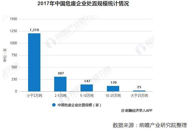 ? ? 正因此,我國危廢處理行業(yè)參與者較多,但企業(yè)規模普遍較小。根據2017年7月的數據統計,我國危廢處理企業(yè)產(chǎn)能低于2萬(wàn)噸、2-5萬(wàn)噸、5-10萬(wàn)噸、10-25萬(wàn)噸和25萬(wàn)噸以上的企業(yè)數量分別為1210家、307家、147家、120家和25家,67%的企業(yè)危廢處理產(chǎn)能低于2萬(wàn)噸。